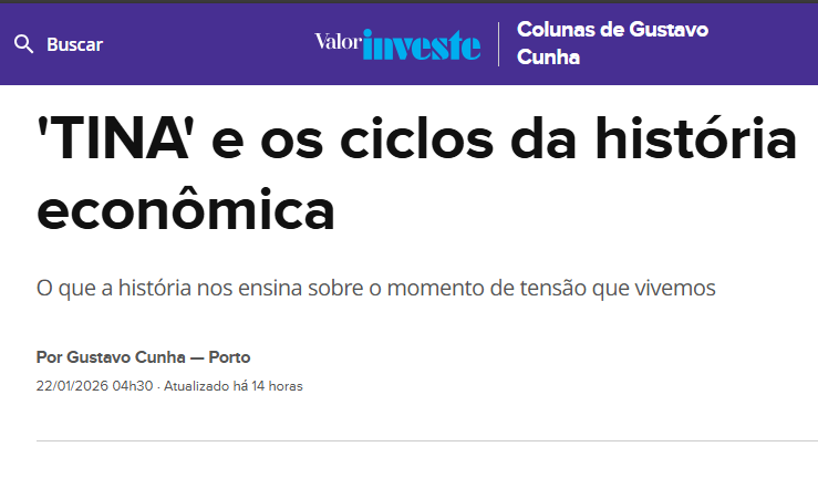 Meu artigo sobre TINA, dessa semana para o Valor Investe, vai exatamente nessa direção. Também vi uma entrevista do Ray Dalio em Davos que vale muito a pena. Ele comenta que o nível “neutro” de ouro nos portfólios globais — incluindo bancos centrais — deveria estar entre 5% e 15%. Segundo ele, estamos muito longe disso. Não sei você, mas eu não tenho nem 5% de ouro (apesar de ter BTC, que no longo prazo pode vir a se provar como o “ouro digital” — tese interessante, mas ainda em teste). O problema é sempre o mesmo: comprar ouro em máxima histórica não é trivial. Mas fica a velha frase martelando na cabeça: o caro de hoje pode ser o barato de amanhã. A ver.