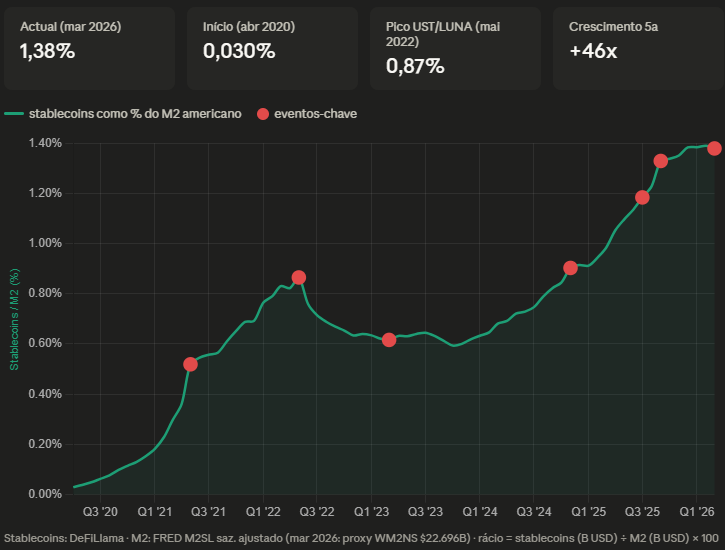 Há cinco anos, as stablecoins representavam cerca de 0,03% do M2 americano — essencialmente zero. Hoje estão em torno de 1,4%. São 46 vezes mais dólares digitais circulando na blockchain em relação à massa monetária total.